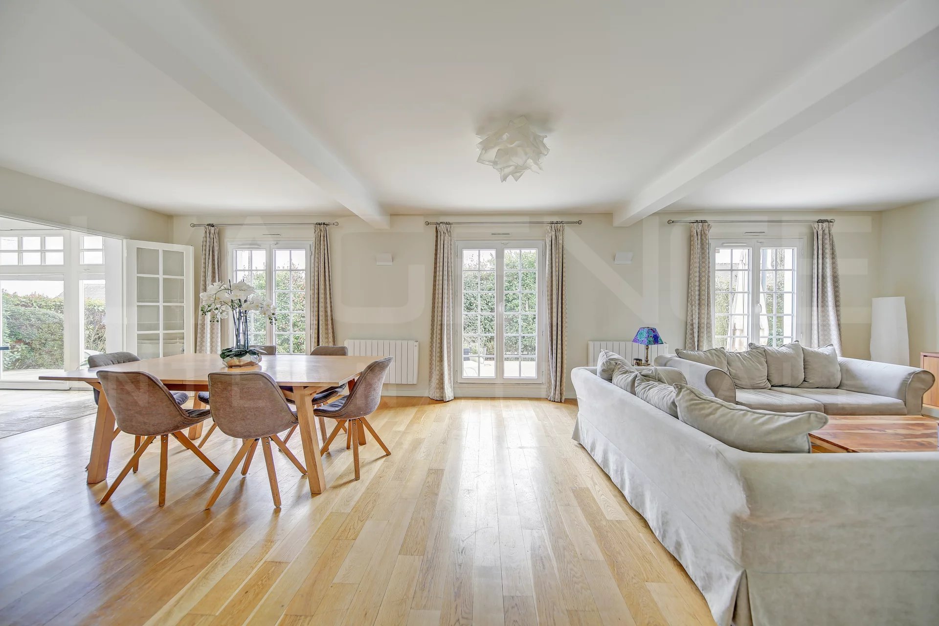 L’entrée, mise en valeur par un beau volume sous plafond, distribue un espace de réception lumineux d'environ 40 m² ouvert sur une cuisine contemporaine entièrement équipée. Une véranda de 14m² prolonge agréablement le séjour et apporte une touche de charme supplémentaire tournée vers l’extérieur. Le rez-de-chaussée comprend également une chambre ou bureau, des toilettes indépendantes et des rangements. À l’étage, quatre chambres spacieuses avec placards, dont une suite parentale avec dressing, salle d’eau avec baignoire et accès à une terrasse privative offrant une vue dégagée jusqu’à la Tour Eiffel. Une seconde salle de bains avec baignoire et douche ainsi que des toilettes séparées complètent ce niveau. Implantée sur un terrain paysager d'environ 750 m², la propriété dispose d’une large terrasse ensoleillée et d’un jardin soigneusement entretenu. En annexes : garage de 31 m², buanderie et chalet de jardin.